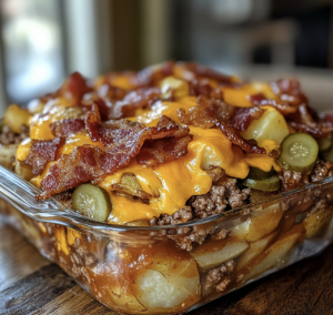 This dish combines everything you love about a juicy cheeseburger — beef, bacon, cheese, pickles — and pairs it with crispy, cheesy potatoes in one comforting, crowd-pleasing casserole. Perfect for busy weeknights, game days, or potlucks!